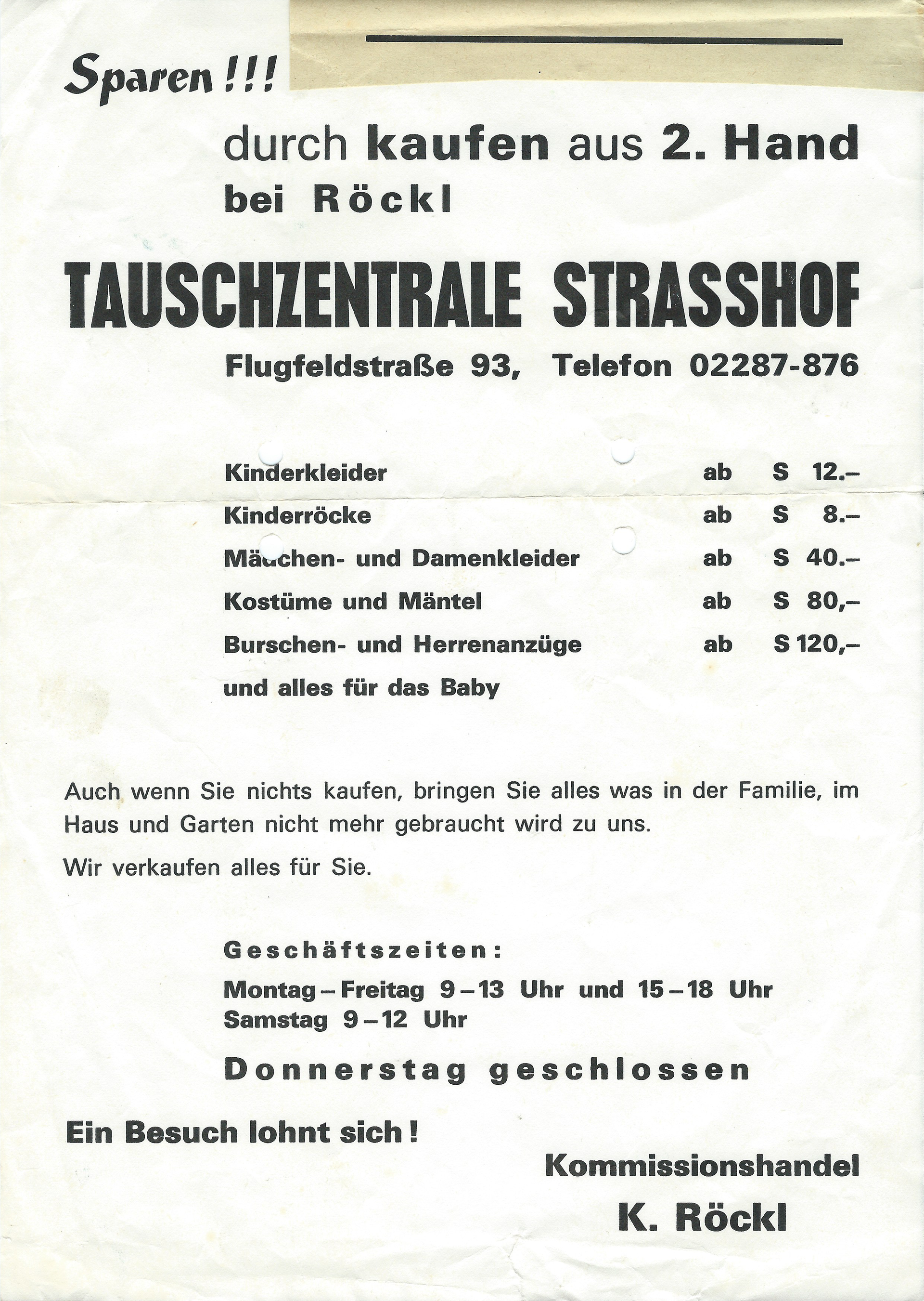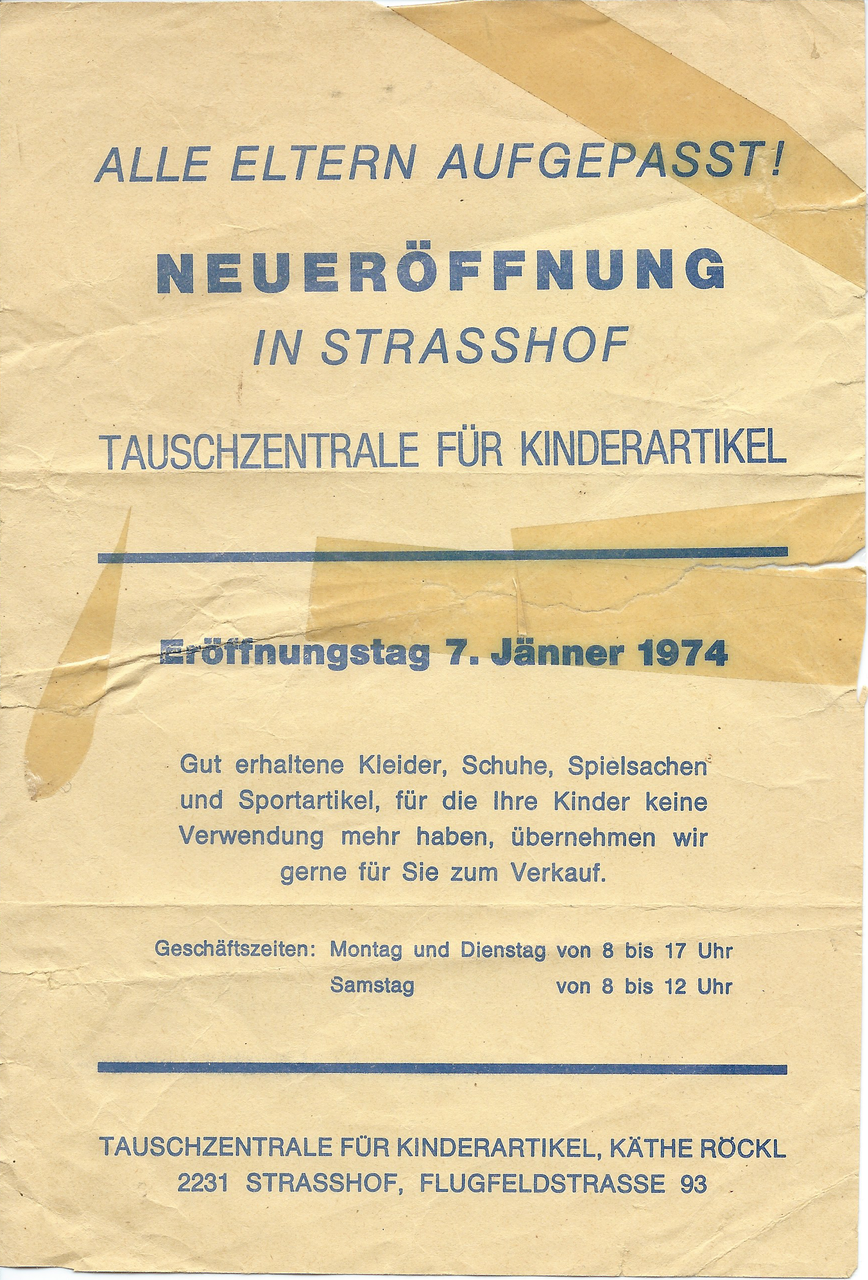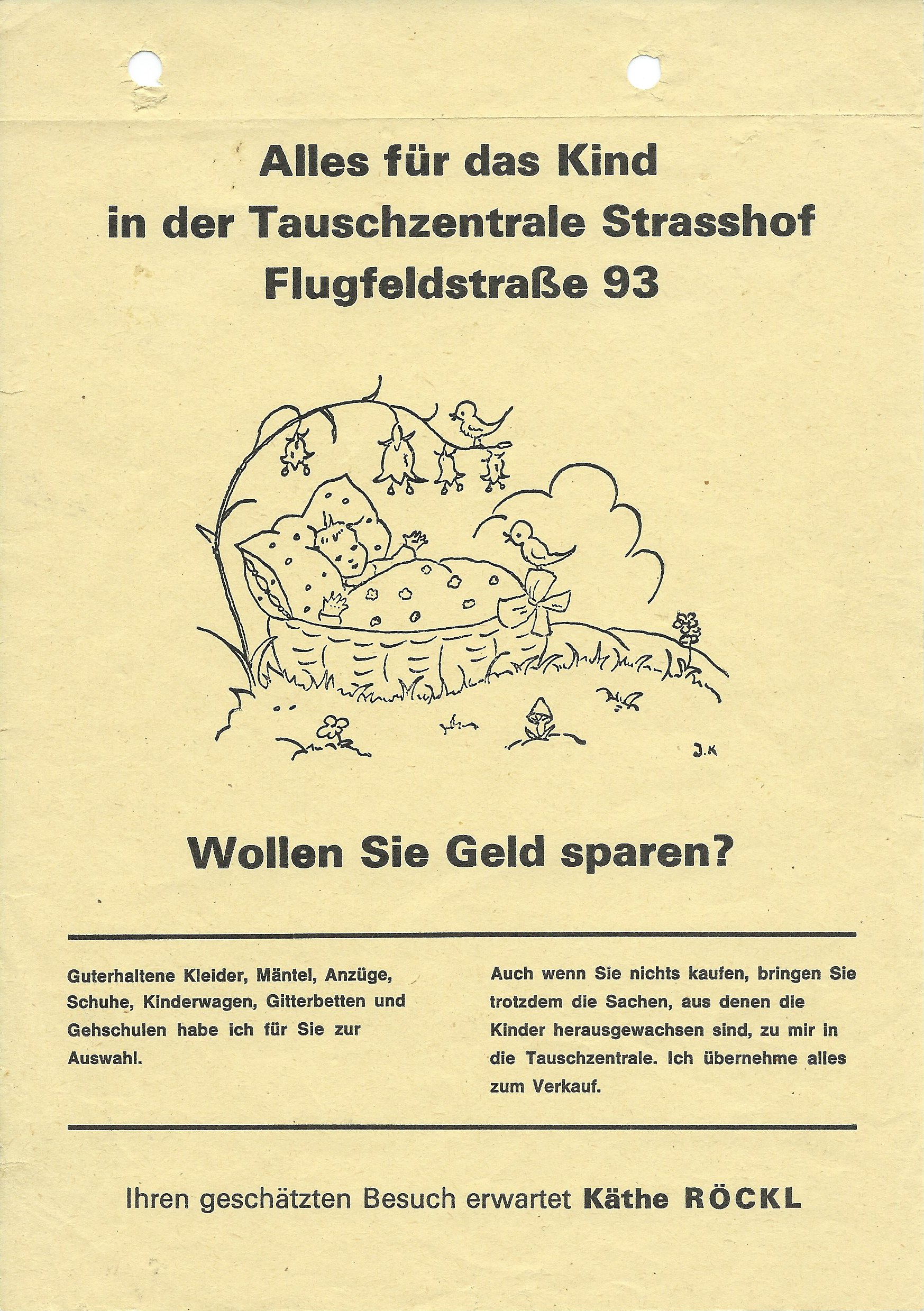 Am 07.01.1974 gründete Käthe Röckl in ihrer umgebauten Garage in der Flugfeldstraße 93 eine Tauschzentrale für Kinderartikel. Was in Wien bereits gang und gäbe war, war im Umland von Wien noch wenig bekannt und wurde entsprechend intensiv beworben.