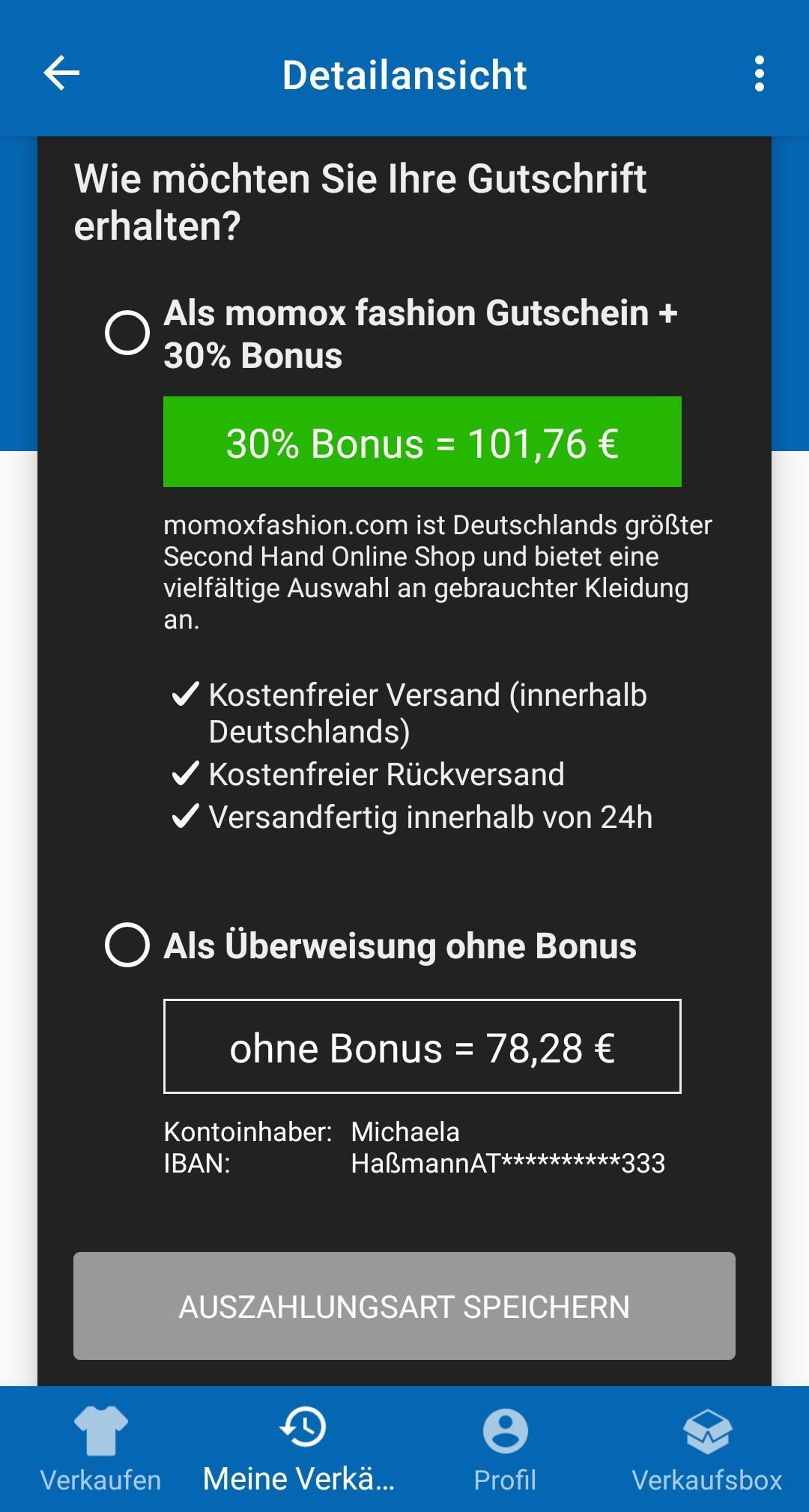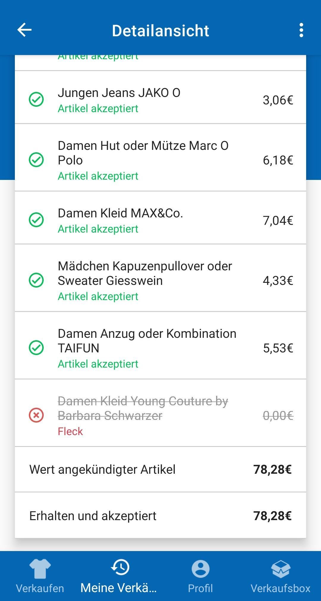 Momox hat ein deutlich breiteres Markenregister, aber fast identische detaillierte Ankaufsbedingungen. Auch hier darf die Kleidung nicht älter als 5 Jahre sein - irgendwie gegen das Grundprinzip von Second Hand oder?! Es hat einige Zeit gedauert bis ich eine Kombi aus Kleidungsstück und Marke gefunden habe die überhaupt angenommen wird! Damen-Bluse von Abercrombie & Fitch "Es tut uns leid", Jungen-Hemd von Jacadi "Leider kaufen wir den Artikel derzeit nicht an". Aber jedenfalls weiß man gleich Bescheid, der Ankaufspreis ist direkt über die App ersichtlich. Dieser wird nach einem Algorithmus tagesaktuell berechnet, scheint also doch ein bisschen ein Glücksspiel zu sein. Herren-Anzug von Jake*s 4,92 € - wie bitte? Herren-Pulli von Selected 0,43 € - das kann ja nur ein schlechter Scherz sein! Wenn ich das mit meinen Auszahlungsbeträgen vergleiche! Zudem wird nur nach Marke und Kleidungskategorie unterschieden, nicht aber nach dem Material und Zustand; und jedes kurze oder lange Kleid, Dirndl, Cocktailkleid usw. wird unter „Kleid“ zum gleichen Preis angekauft. Da hilft auch der 10 % Bonus für die Anmeldung nicht viel, bzw. gibt es nochmals 30 % dazu wenn der Betrag als Momox-Gutschein statt direkt ausbezahlt werden soll. Einige akzeptable Ankaufspreise habe ich dennoch gefunden. Zum DPD Pickup und ab geht’s. Eine Woche später kam die Info dass das Paket angekommen war, nur 2 Tage danach die Bestätigung dass alle Artikel bis auf einen akzeptiert wurden! OK das kann ich verschmerzen. Dieser Artikel soll gespendet werden, für ein Stück die Rücksendung zu bezahlen lohnt sich nicht. Somit wandern 78,28 € auf mein Konto! So genau können sie es mit nicht älter als 5 Jahre und auch mit der Kategorie doch wieder nicht nehmen, ein Teil wurde unter einer anderen Kategorie eingestellt als von mir angegeben…