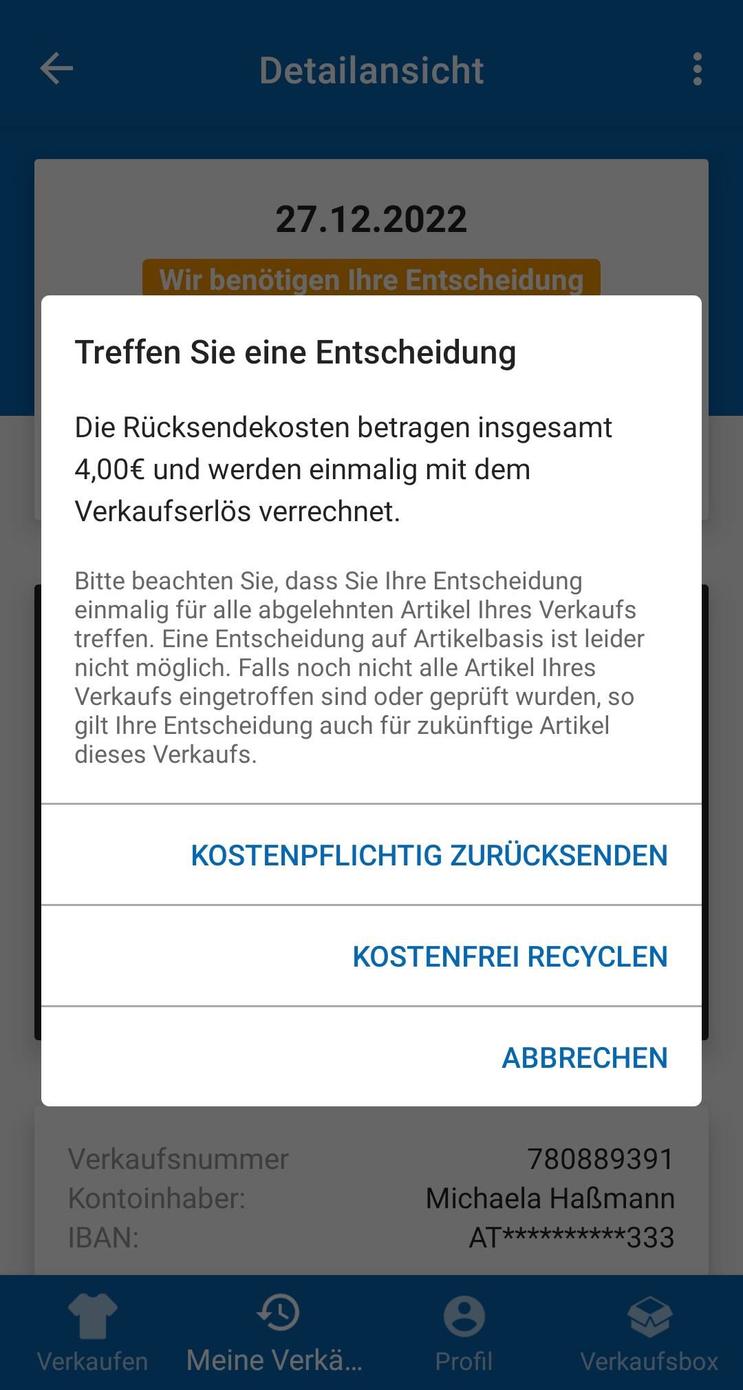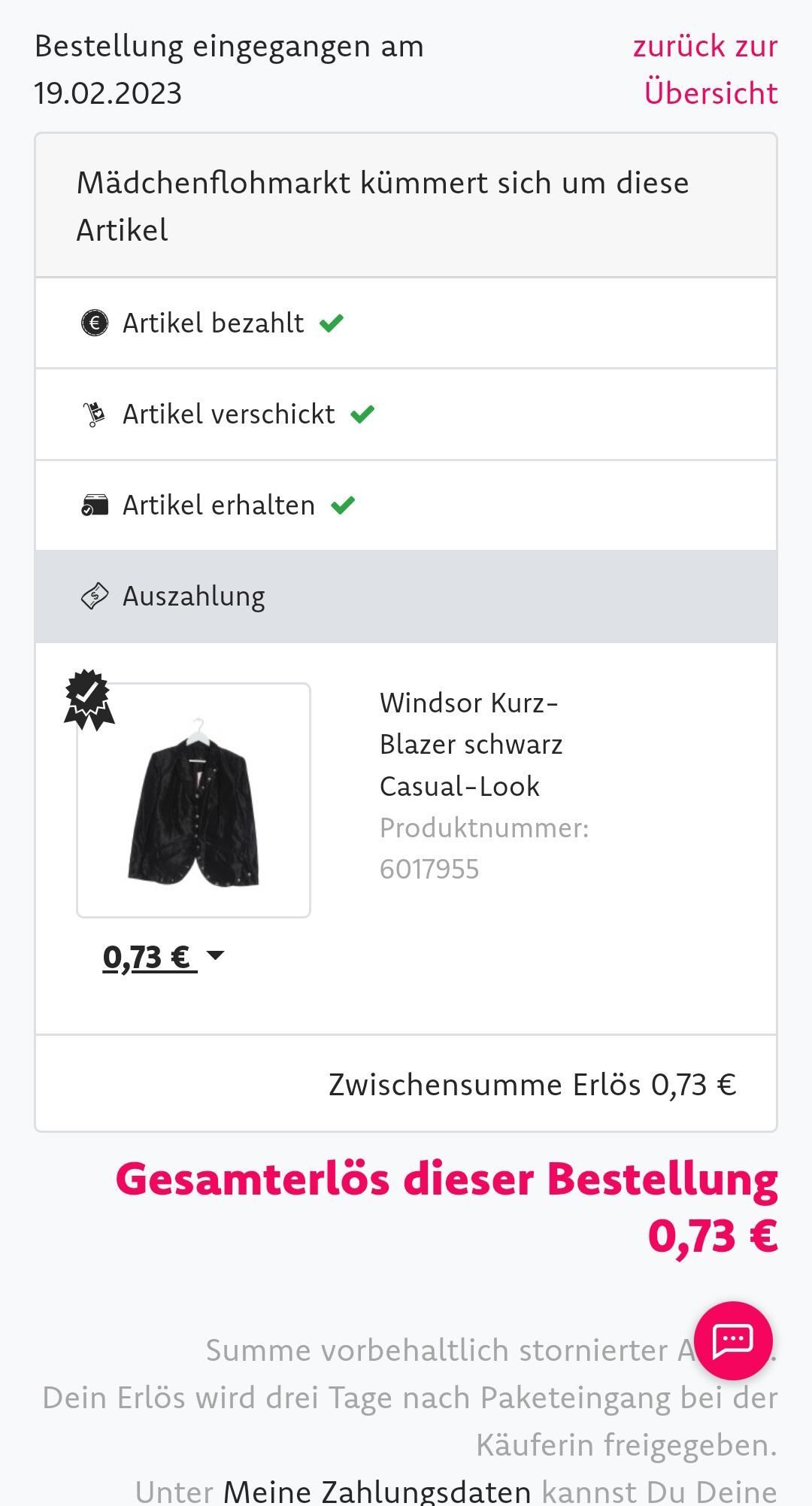 2 Wochen später war das erste Teil verkauft. Um 14,63 €. Minus der Mindestprovision von 13,90 € macht unglaubliche 0,73 € Erlös. Huch, da wäre wegschmeißen wirklich billiger gewesen. Hatte „Wie groß ist mein Anteil?“ nicht ein bisschen mehr versprochen? Klar, wenn das Teil um 20,90 € weggegangen wäre wie eingestellt hätte ich ca. 6 € erhalten. Selbst wenn alle 14 gesendeten Artikel um jeweils 15 € verkauft werden würden, gäbe das in Summe gerade einmal 15,40 € Erlös für mich. Uff, das ist schon recht dürftig, ganz ehrlich! Dazu lese ich seit Jänner 2023 nur mehr 1 Stern-Bewertungen die von nicht erfolgten Auszahlungen schreiben, von vermuteter Insolvenz und anhängigen Anzeigen. Bin also gespannt ob ich überhaupt einen Cent sehen werde! Einige Stücke stehen schon bei unter 13,90 € und würden mir daher bei einem Verkauf gar nichts einbringen. Die würde ich gerne rausnehmen, geht aber nicht. Ich kann nur Fotos einstellen und den Preis ändern, sowie mit Interessentinnen kommunizieren. Am 20.09.2023 habe ich die Auszahlung von heißen 8,73 € beantragt und den Betrag nach 3 Wochen erhalten. Offenbar funktioniert die Auszahlung nun nach einer Neuübernahme des Unternehmens wieder. Bewertung: für diese geringen Auszahlungsbeträge gibt es maximal 1 Stern.