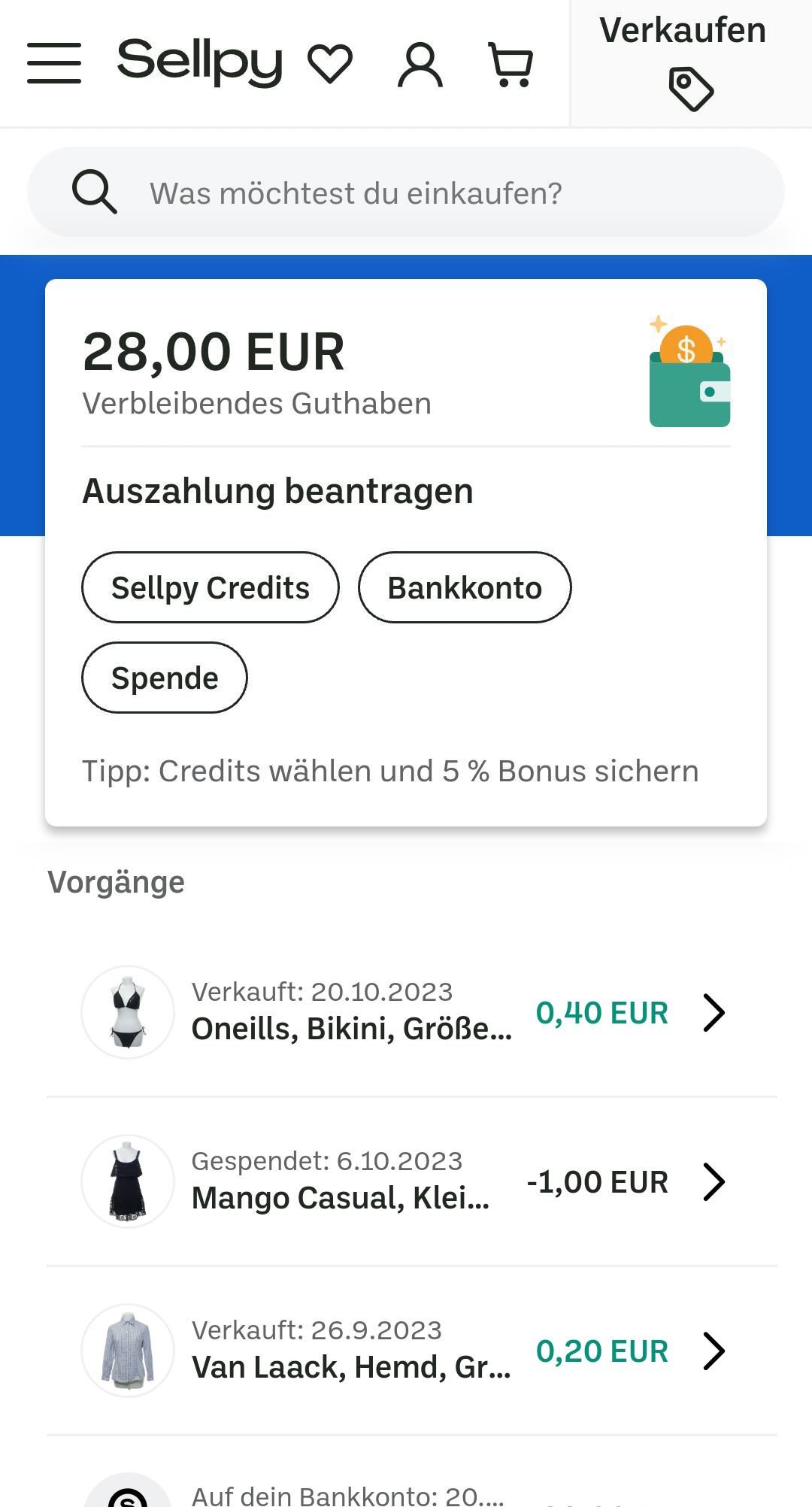 Da Sellpy die geringsten Verkaufspreise aller Online-Second Hand-Anbieter und Ware aller Marken hat, wollte ich hier einfach nur all meine übrigen Ladenhüter loswerden. Denkste! Der gleiche Algorithmus-Schmäh, alles was über 5 € bewertet wird, kann eingeschickt werden. Es gibt also keine Info über den voraussichtlichen Preis, nur ein vermutlich ja oder nein. Auch hier, je unbekannter und seltener die Kombi aus Marke und Artikel ist, desto eher erhält man ein ja. Das leuchtet ein, weil an die 0815-Ware kommt Sellpy ja sowieso jederzeit... Die Rückmeldung „Werden wir voraussichtlich nicht zum Verkauf anbieten - unabhängig vom Zustand“ erhalte ich mehrmals. Dennoch habe ich zu Testzwecken auch einige solche Stücke sowie dezidierte Spendenware mitgegeben. Die erste Tasche konnte ich gratis bestellen, sie wurde mir per Post zugeschickt. Mein Tipp: Bei jedem Kauf bei Sellpy ist die blaue Tasche dazu gratis! Der Verkauf würde in 9 Wochen starten, daher wurde mir geraten Gewand für Frühling / Sommer auszuwählen. Die blaue Tasche darf max. 15 kg wiegen, ob ein Plastiksackerl wirklich so viel aushält? Das Fassungsvermögen ist jedenfalls gegeben, es haben 17 Artikel Bekleidung und Schuhe hineingepasst. Davon wurden 4 Teile mit Begründung abgelehnt, von denen einer ohne meine Reklamation dann doch im Verkauf gelandet ist. Transparent und kundenfreundlich wird aufgelistet, in welchen Stufen der Preis reduziert wird und wieviel mir dann noch davon bleibt. Sogar ein voraussichtlicher Verkaufspreis wird genannt. Für den Bikini um 14,00 € bekomme ich 4,60 €. Das ist zwar immer noch eine gewaltige Marge, aber dennoch akzeptabel - verglichen mit Mädchenflohmarkt wo ich bei dem Verkaufspreis gar nichts erhalten hätte! Das Guthaben kann jederzeit flexibel bis zur maximalen Höhe abgeschöpft werden. Minus 1 € für einen gespendeten Artikel? Naja... Ich habe die Auszahlung von in Summe exakt 28 € am 20.09.2023 beantragt, nachdem der Verkauf beendet war. Auf das Geld musste ich leider eineinhalb Monate warten - bei versprochenen wenigen Werktagen, da die dafür nötige e-mail zur Bestätigung nicht angekommen ist... nach der Änderung der e-mail-Adresse, verbunden mit einer nochmaligen Wartezeit von 2 Wochen, habe ich schlussendlich am 07.11.2023 mein Geld aufs Konto überwiesen bekommen (für einen Sack den ich am 03.03.2023 abgeschickt habe). Unbegrenzt steuerfrei scheint dieses Nebeneinkommen nicht zu sein, laut einer "Meldepflicht innerhalb der EU für digitale Plattformen (DAC7)" muss man ab 30 verkauften Artikeln oder 2000 € ein Formular für die lokale Steuerbehörde ausfüllen. Bewertung: 2-3 Sterne.